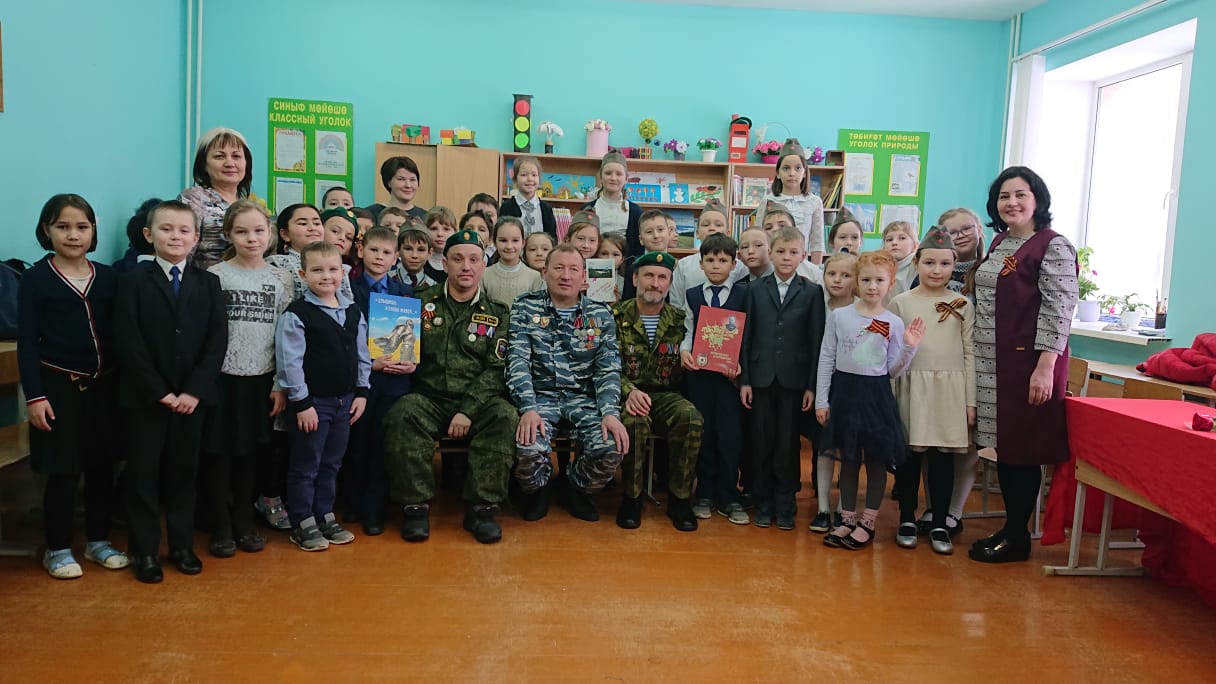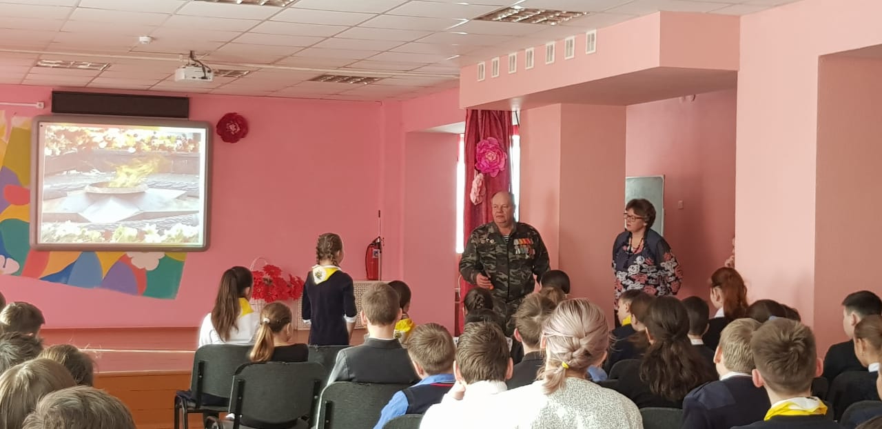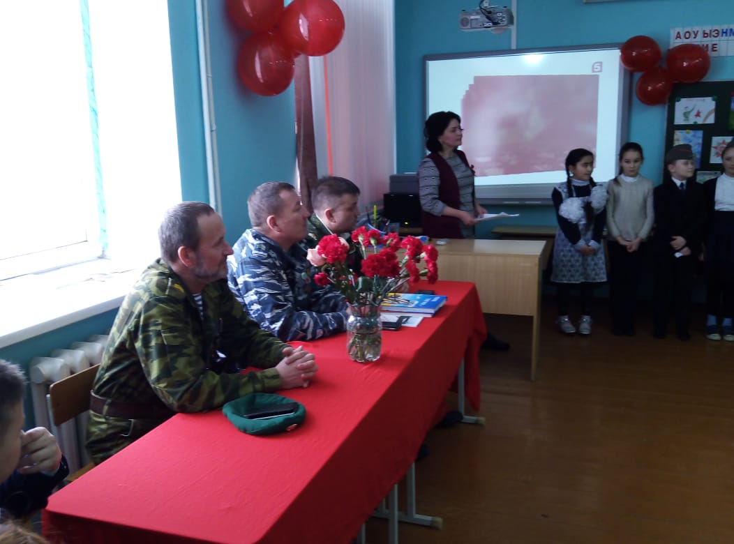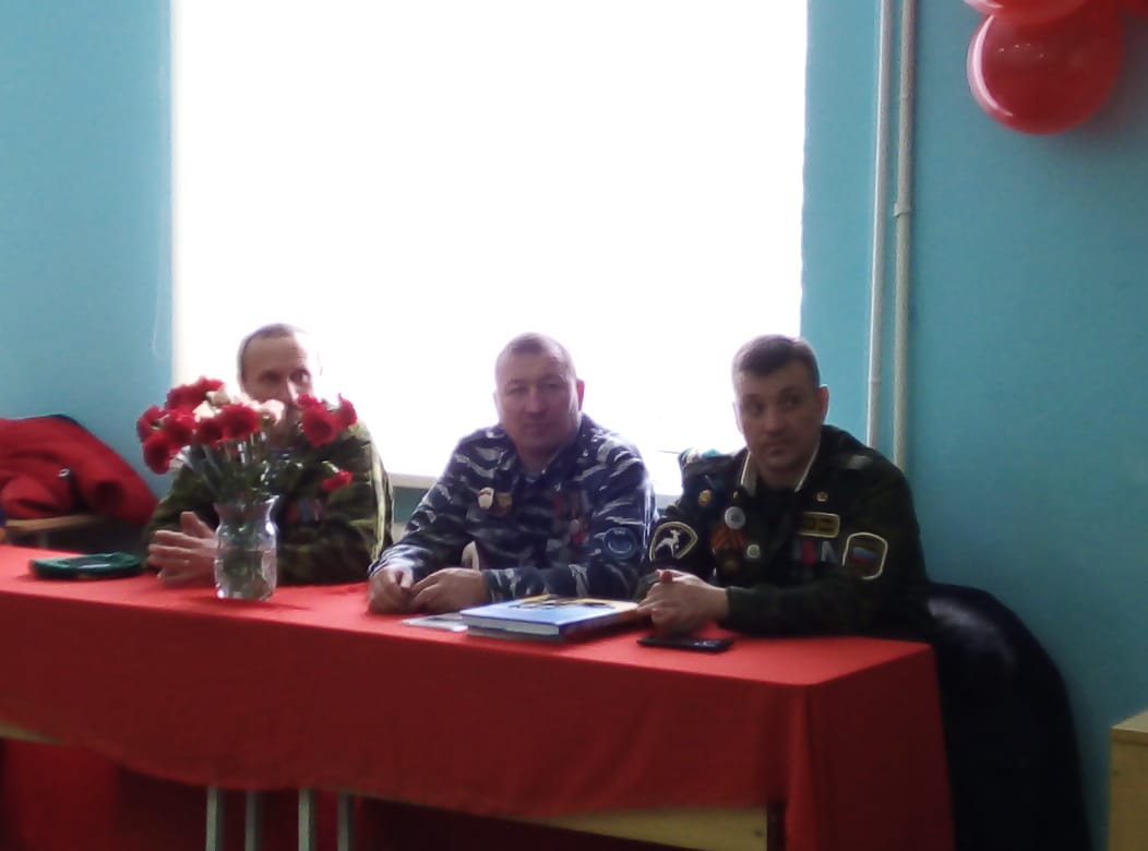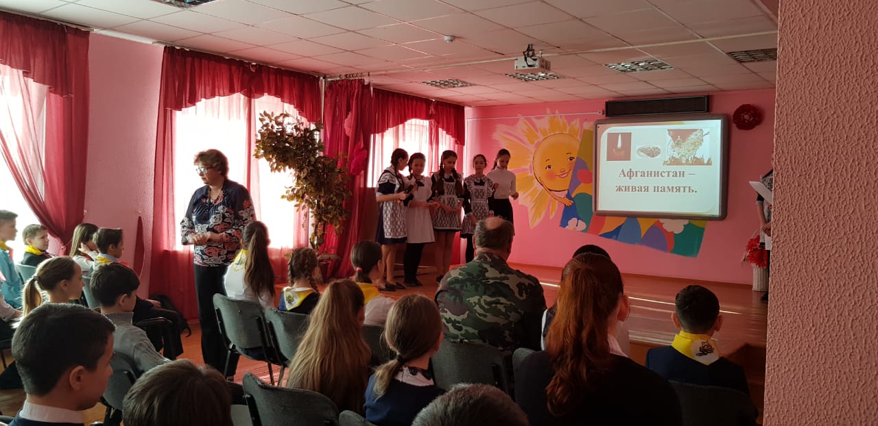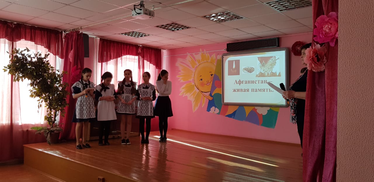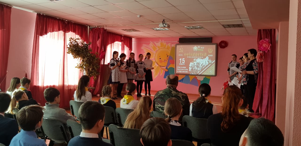 Были организованы встречи с ветеранами боевых действий в Афганистане. В 6-х классах ребята пригласили на встречу Девяткина Дмитрия Фёдоровича. Он рассказал о тяжёлых военных буднях своих товарищей в Афганистане. Тщательно подготовились ко встрече с героями и ребята начальной школы. Они организовали целый концерт: выучили песни, стихи. В конце встречи была организована совместная фотосессия и возложение цветов к бюсту Героя Советского Союза В.Бесценного.